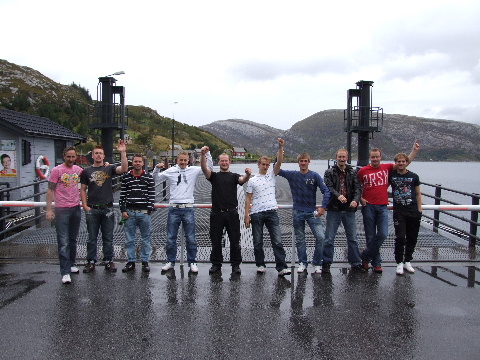 Ein fornøgd gjeng på veg heim. Dette bildet er teke på ferjekaia på Oldeide.