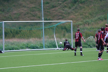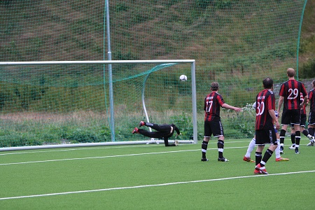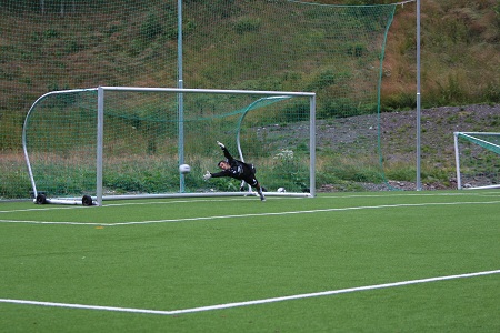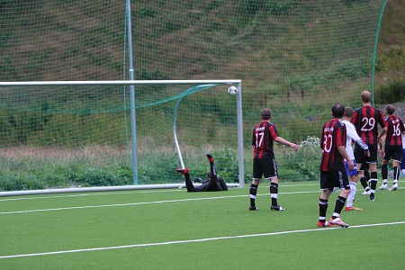 Kjetil har her redda ballen og slår han i kryssstolpen og som du ser litt lenger nede so får han kontroll til slutt.